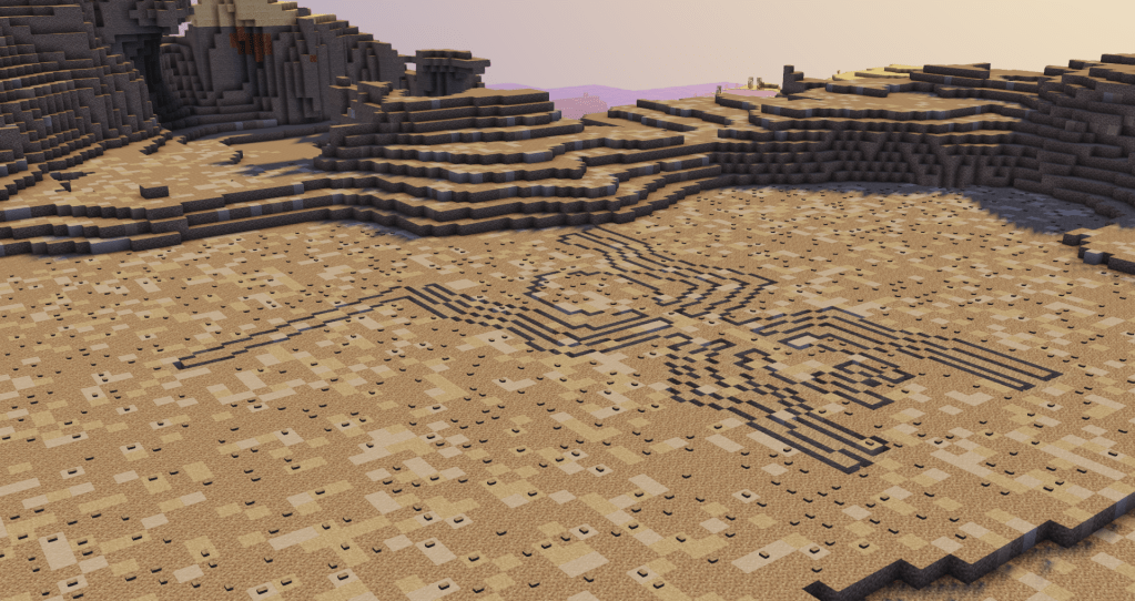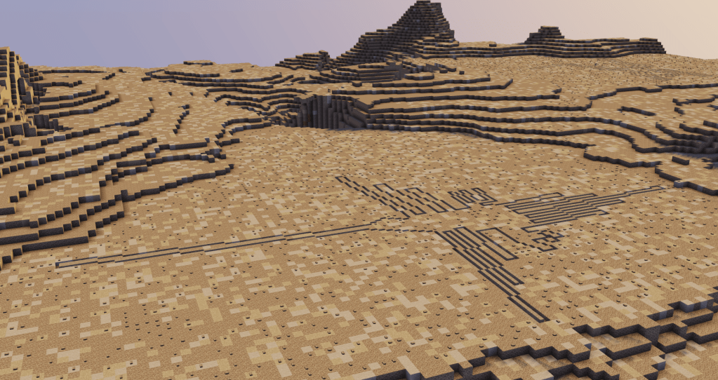 Minecraft can do a lot, but it can’t do everything. When I first thought to make the Nazca Lines, I thought I might use gravel and path blocks. Path blocks are a few pixels shorter than full blocks like gravel, so it would be a way to simulate the scraping the Nazca did without going too deep. Slabs would show that sort of depression, too, but if we think of minecraft blocks as a meter deep, slabs would be 50cm thick. The depression would be 50cm rather than 10-30cm, which is a bit too deep for what I was trying to do.